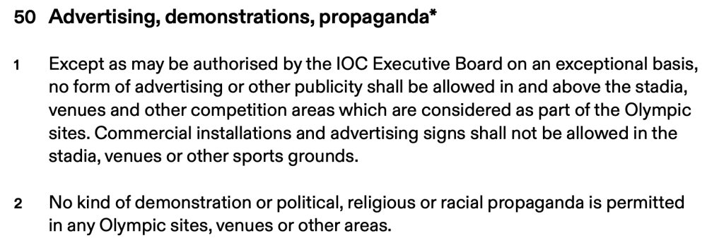 《奧林匹克憲章》第50條第二款規(guī)定,“不允許在任何奧運(yùn)會(huì)地點(diǎn)、比賽場(chǎng)館或其他奧運(yùn)區(qū)域宣揚(yáng)政治、宗教或種族觀點(diǎn)”。