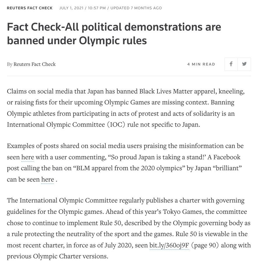 遵守《奧林匹克憲章》和當(dāng)?shù)胤煞ㄒ?guī),歷來(lái)是每一位參賽選手的責(zé)任和義務(wù),這本來(lái)就是一件毫無(wú)爭(zhēng)議的事情。去年,路透社在一篇報(bào)道中為日本禁止運(yùn)動(dòng)員在東京奧運(yùn)會(huì)期間宣揚(yáng)政治觀點(diǎn)的做法進(jìn)行辯護(hù),稱這種禁令并非只有日本實(shí)行,而是國(guó)際奧委會(huì)一以貫之的規(guī)定。這篇報(bào)道還特意指出,國(guó)際奧委會(huì)在東京奧運(yùn)會(huì)前決定繼續(xù)實(shí)行奧林匹克憲章第50條,以此維持體育運(yùn)動(dòng)的中立性。