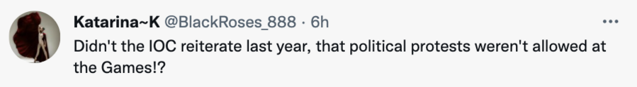 一名海外網(wǎng)友在留言中呼應(yīng)了《奧林匹克憲章》的規(guī)定:“國(guó)際奧委會(huì)不是在去年重申過(guò)賽會(huì)上不允許政治示威嗎?”