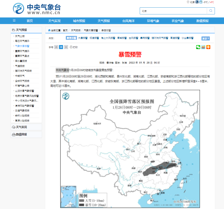 中央氣象臺1月28日06時繼續發布暴雪黃色預警: