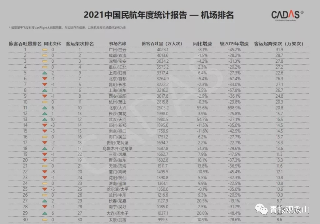 日前,CADAS(民航資源網旗下的民航數據分析系統)發布了《2021中國民航年度統計報告——機場排名》,粗略統計出2021年各大機場旅客吞吐量排名。