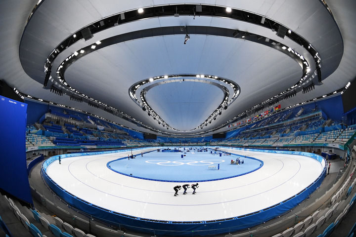 1月30日,運(yùn)動(dòng)員們?cè)趪?guó)家速滑館“冰絲帶”進(jìn)行訓(xùn)練,備戰(zhàn)北京冬奧會(huì)比賽。新華社記者 武巍 攝