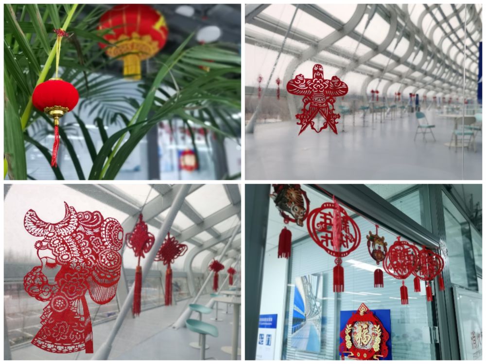 “冰絲帶”內(nèi)充滿年味的剪紙、中國(guó)結(jié)和燈籠