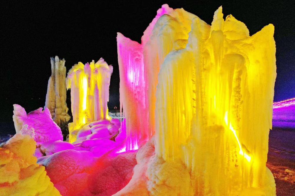 1月25日,沈陽市沈北新區單家村,稻夢小鎮的冰燈流光溢彩。新華社記者楊青 攝
