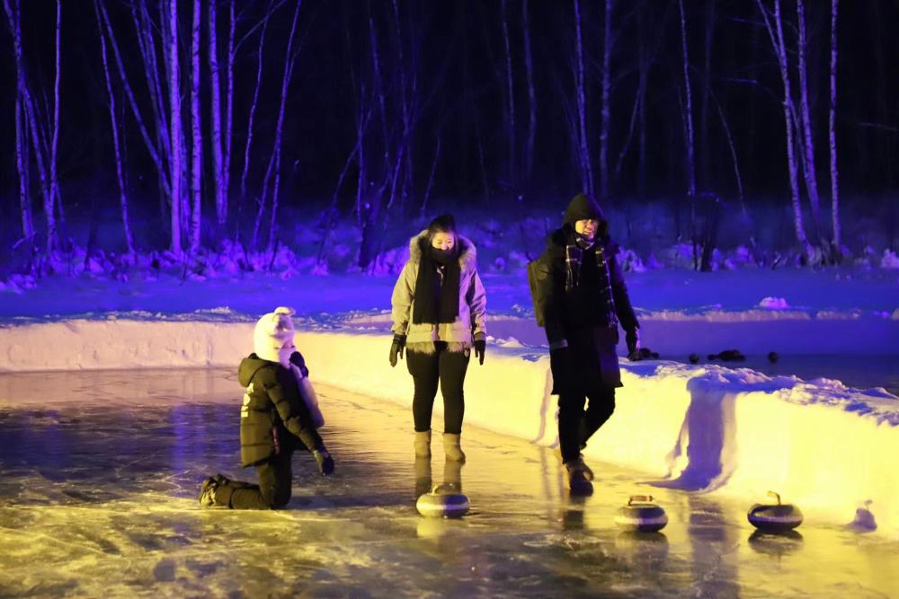 1月12日,一家三口游客在漠河市北極村的冰壺場內游玩。新華社記者徐凱鑫 攝