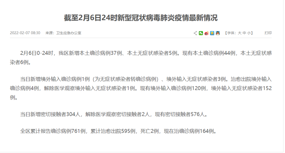 2月6日0-24時,我區新增本土確診病例37例、本土無癥狀感染者5例。現有本土確診病例44例,本土無癥狀感染者6例。