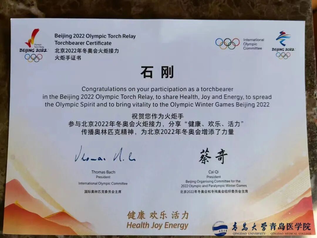 北京2022年冬奧會火炬傳遞于2月2日拉開帷幕。青島大學醫學部校友石剛作為冬奧會火炬手參加了2月2日在北京奧林匹克森林公園的火炬傳遞,排位為第102號。此次火炬傳遞中,青島大學有兩位校友參與,在他前面,青島大學校友梁楠郁作為第81棒火炬手,也于當天上午在北京奧林匹克森林公園參加了火炬傳遞。