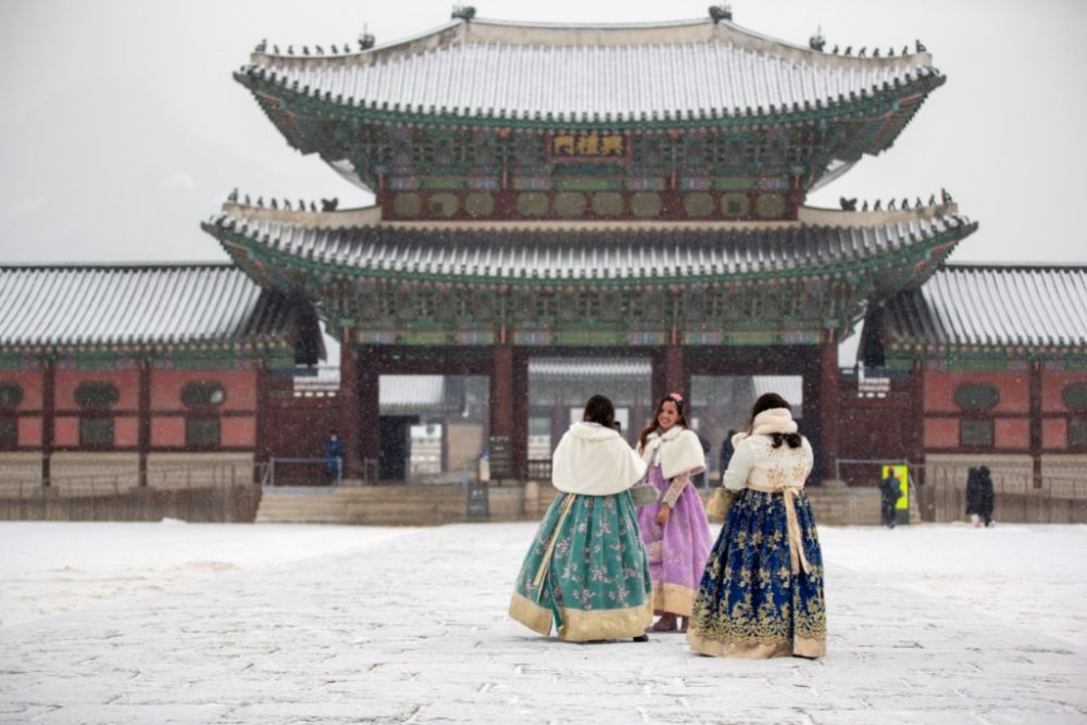1月19日,在韓國首爾,游客在雪中游覽景福宮。(新華社記者王益亮攝)