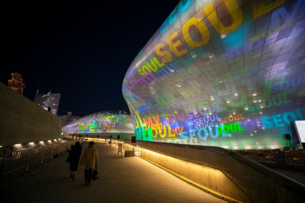 2021年12月17日在韓國首爾東大門設(shè)計(jì)廣場拍攝的“首爾之光”燈光秀。(新華社記者王益亮攝)