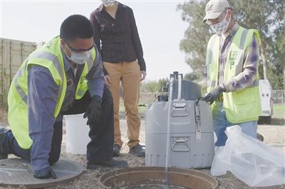 加州大學伯克利分校研究人員開發了一種從下水道系統中收集未經處理的污水并測試其是否存在新冠病毒的方法。圖為該校員工從下水道中取出廢水自動進樣器。圖片來源:艾琳易/加州大學伯克利分校