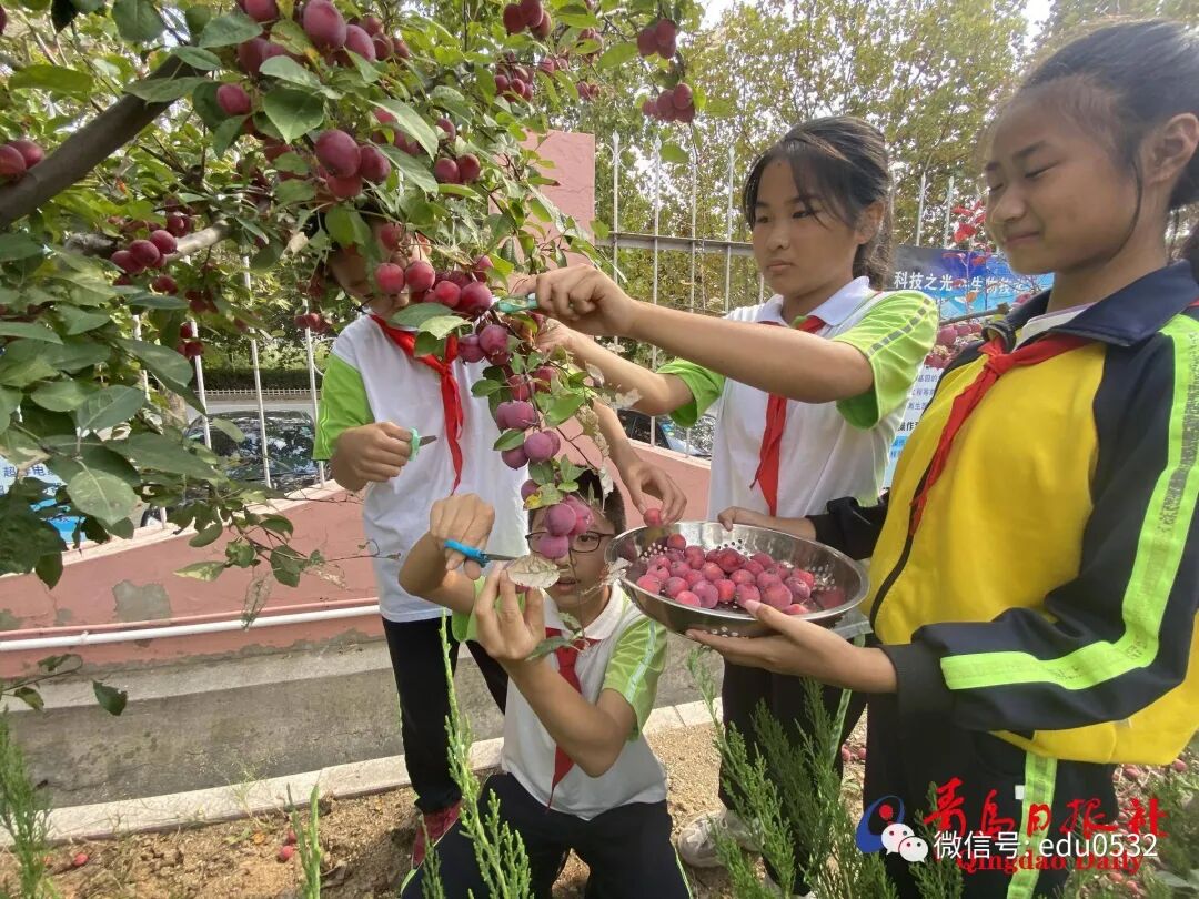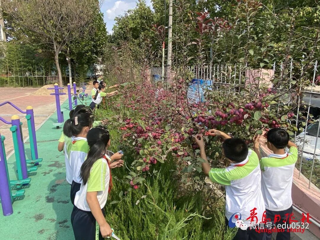 當天下午,在大澤山小學的海棠種植實踐區,紅彤彤的果子綴彎枝頭,六年級一班的孩子們仔細挑選個大飽滿的海棠果收入盆中。“挺甜的。”“好吃,就是有一點點澀,但是煮熟就不澀啦”……孩子們一邊摘果子,一邊品嘗著秋天的專屬美味。
