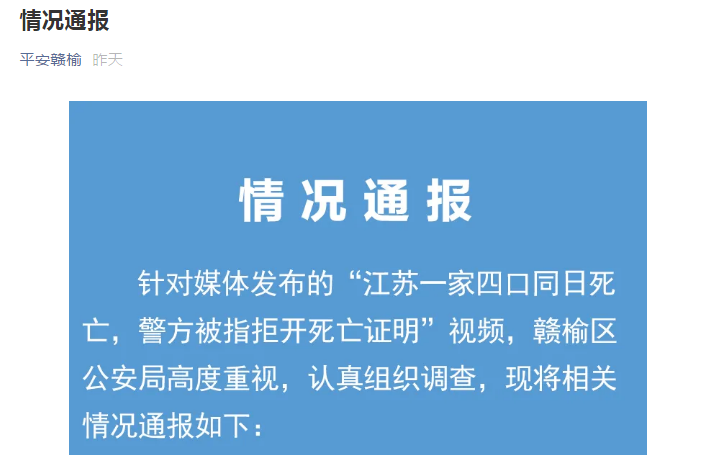 江蘇一家四口同日死亡,警方回應“拒開死亡證明”