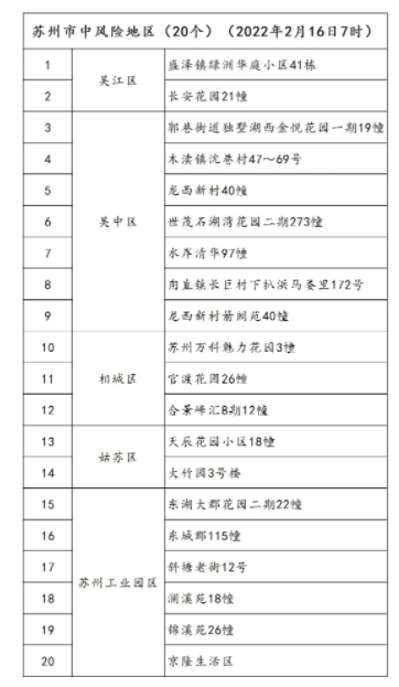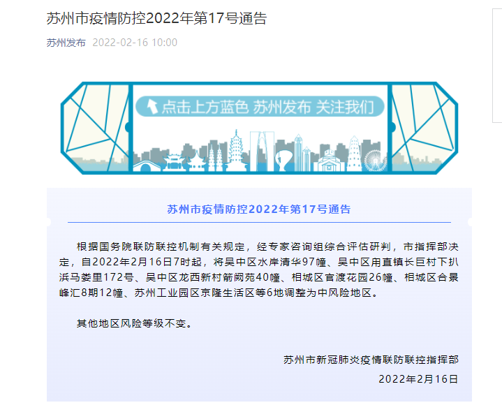 根據國務院聯防聯控機制有關規定,經專家咨詢組綜合評估研判,市指揮部決定,自2022年2月16日7時起,將吳中區水岸清華97幢、吳中區甪直鎮長巨村下扒浜馬婁里172號、吳中區龍西新村箭闕苑40幢、相城區官渡花園26幢、相城區合景峰匯8期12幢、蘇州工業園區京隆生活區等6地調整為中風險地區。