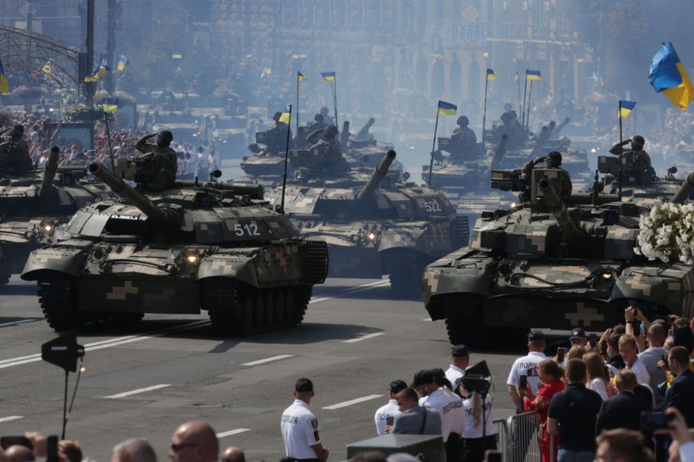 2021年8月24日,在烏克蘭首都基輔,坦克在閱兵式上列隊行進。當日,烏克蘭在首都基輔舉行閱兵,慶祝獨立30周年。(新華社發,謝爾蓋·斯塔拉斯堅科攝)