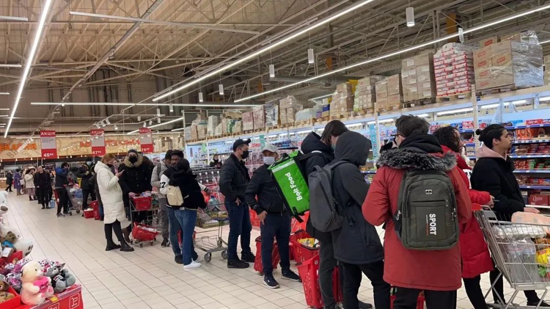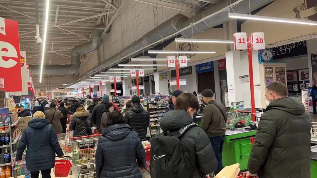 他的一名在烏克蘭北部切爾尼科夫州的華人朋友在超市購物時看到,當?shù)鼐用裾谑浙y臺前排長隊。