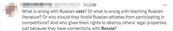 另一名網(wǎng)友顯得有些難以置信:俄羅斯的貓有什么錯?傳播俄羅斯文化又有什么錯?為什么禁止俄運(yùn)動員參賽?就因為這一切與俄有關(guān),誰給了它們權(quán)利摧毀別人的合法資產(chǎn)?