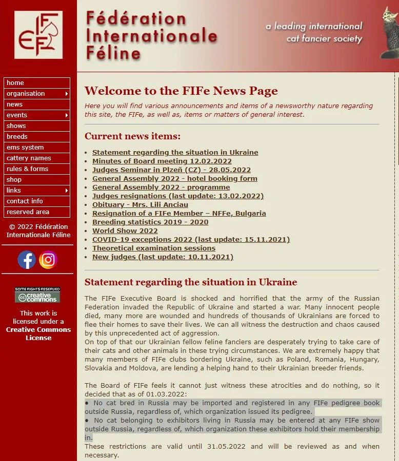 貓科動物國際聯(lián)合會(FLFE)網(wǎng)站公告部分內(nèi)容。圖片來源:FIFe網(wǎng)站網(wǎng)頁截圖。