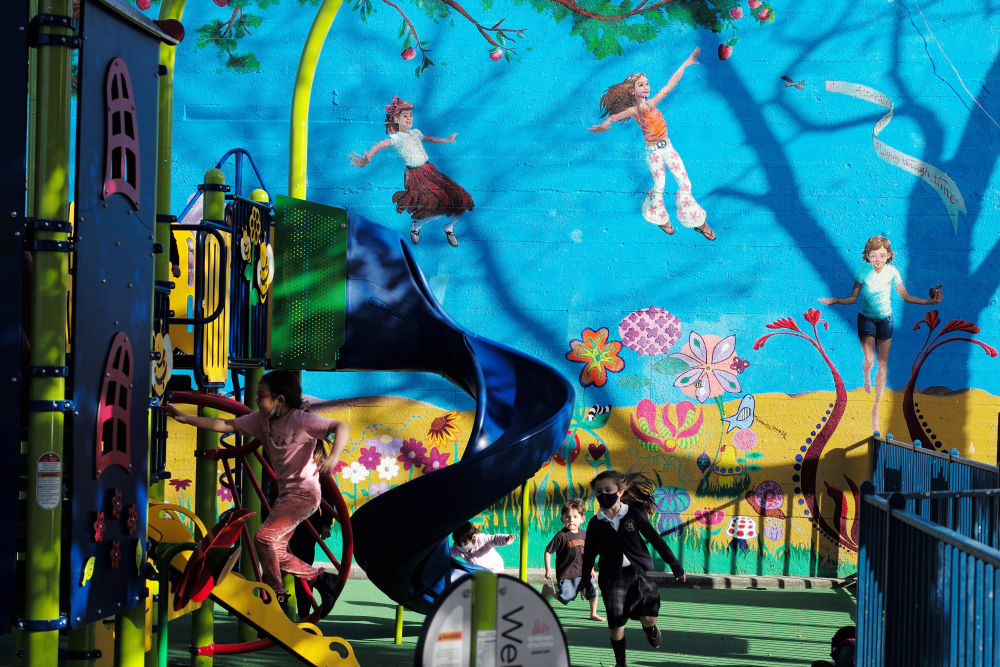 2021年3月29日,兒童在美國加利福尼亞州北部小城伯靈格姆街頭的一個重新開放的游樂場玩耍。新華社記者吳曉凌攝