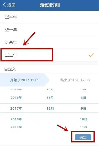 第三步:點(diǎn)擊右上角的“篩選”選擇“近三年”,右下角點(diǎn)擊“確定”