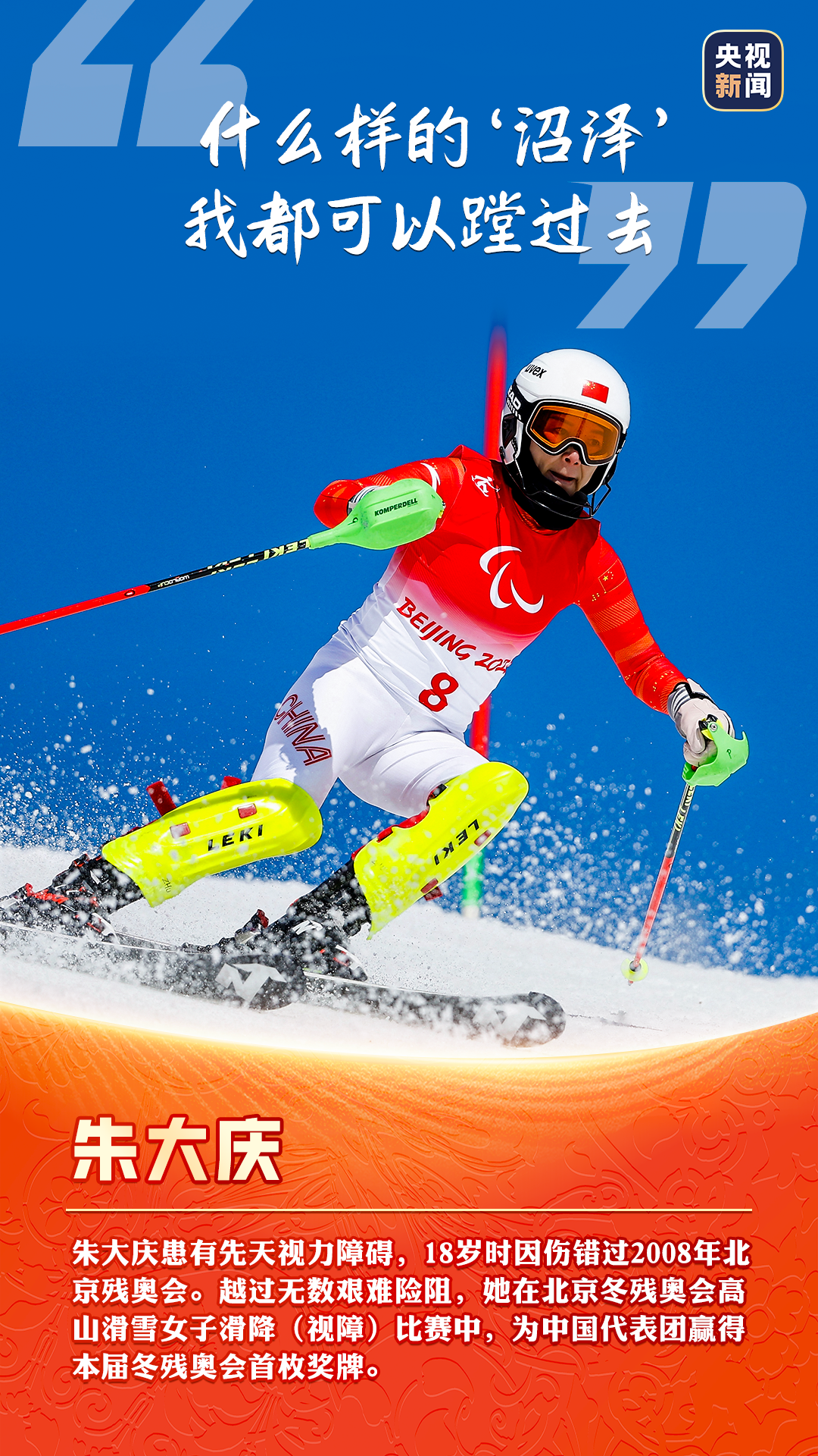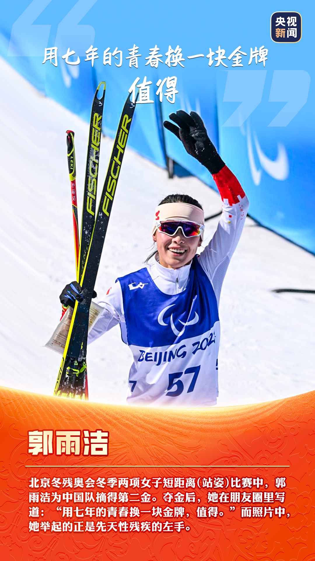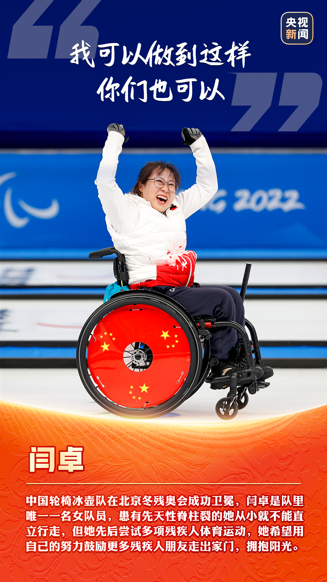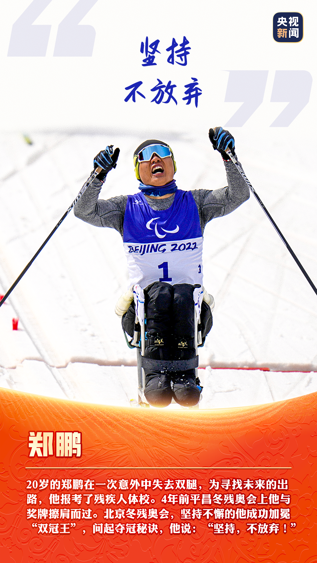 3月13日,北京冬殘奧會圓滿閉幕,中國隊以獎牌榜第一的成績順利收官。中國殘疾人運動員們在賽場上留下了耀眼的成績,更傳遞了自強不息的精神。“堅持,不放棄!”“想讓國旗在最高處!”……這些話語展現了運動員們的頑強拼搏、積極樂觀。看圖,致敬每一份奮斗和堅持!