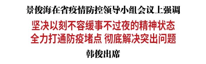 3月14日,省委書記景俊海連夜主持召開省疫情防控領(lǐng)導(dǎo)小組會(huì)議。他強(qiáng)調(diào),全省上下要切實(shí)把思想和行動(dòng)統(tǒng)一到習(xí)近平總書記關(guān)于疫情防控工作的重要講話重要指示精神上來,按照孫春蘭副總理部署要求,以刻不容緩、事不過夜的精神狀態(tài),全力打通防疫堵點(diǎn),徹底解決突出問題,堅(jiān)決打贏長(zhǎng)春保衛(wèi)戰(zhàn)、吉林殲滅戰(zhàn)、各地阻擊戰(zhàn)。省委副書記、省長(zhǎng)韓俊出席會(huì)議。