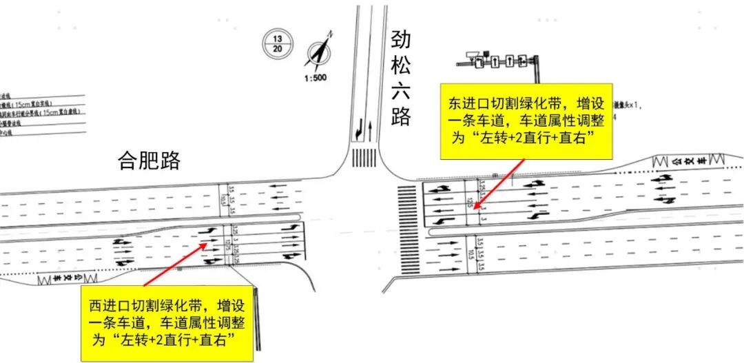 (1)合肥路勁松六路東進口切割綠化帶,增設一條左轉車道,車道屬性調整為“左轉+2直行+直右”;西進口切割綠化帶,增設一條左轉車道,車道屬性調整為“左轉+2直行+直右”;