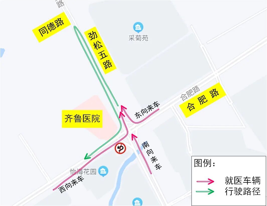 (5)由合肥路勁松五路路口前往齊魯醫院車輛需向北駛入勁松五路,由勁松五路同德路路口掉頭繞行,在勁松五路北進口排隊入院。