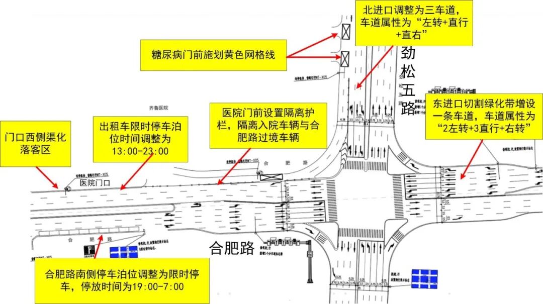 (3)合肥路齊魯醫院門前增設隔離護欄,分離入院車輛與合肥路過境車輛;門口東側出租車限時停車泊位停放時間調整為13:00-23:00;西側施劃落客區;