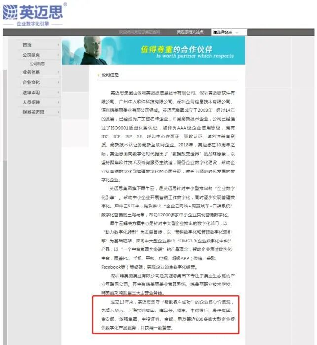 英邁思集團官網介紹稱,英邁思堅守“幫助客戶成功”的企業核心價值觀,先后為華為、上海寶鋼集團、唯品會、順豐、中信銀行、康佳集團、富安娜、華強集團、中投證券、金蝶、用友等近600多家大型企業提供數字化產品服務,并獲得一致贊譽。