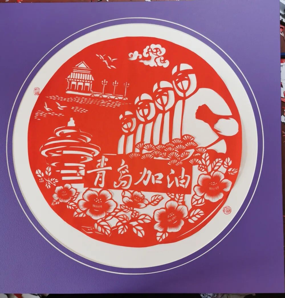 市民間文藝家協會副主席蘇霞創作的剪紙作品《青島加油》。該幅剪紙采用圓形構圖,寓意廣大黨員干部群眾團結一心,共同抗疫。4位身著防護服的醫護人員站成一排,構成抗擊新冠病毒的銅墻鐵壁,緊握的拳頭表達出抗疫必勝的信心。棧橋、五月的風和波浪體現出島城特色,飛翔的海鷗銜來春的消息。青翠的松枝象征全市人民堅強的意志,綻放的耐冬花表示疫情將會很快消失,萬紫千紅的春天就要到來。