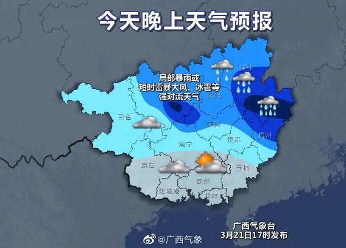 預計隨著冷空氣逐漸向南推進,今天晚上,河池、柳州、桂林、賀州、梧州等市和來賓、南寧兩市北部有中到大雨,局部暴雨或短時雷暴大風、冰雹等強對流天氣。