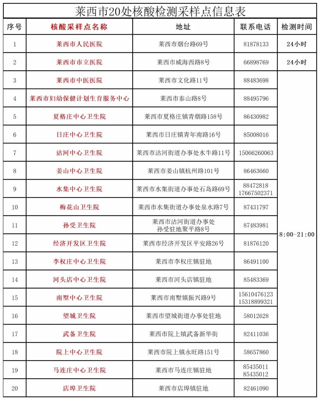 (3)3月23日萊西市衛生健康局發布《關于做好“愿檢盡檢”核酸采樣工作的通知》,為結合我市復工復產人員核酸檢測需求,自3月23日起重啟萊西市20處“愿檢盡檢”核酸采樣點,其中萊西市市立醫院、萊西市人民醫院、萊西市中醫醫院、夏格莊中心衛生院均可出具核酸檢測證明,滿足條件的市民可根據要求進行檢測并在相應時間獲取證明。具體情況大家可以就近電話咨詢哦~~