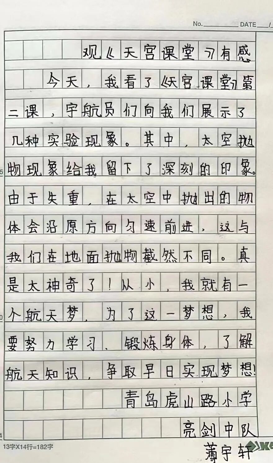 天宮課堂結束后,隊員們將自己內心難掩的激動和興奮述諸筆端,他們熱情洋溢的表達著對航天事業的向往對偉大祖國的崇拜。今天他們懷揣夢想拿起的是手中的筆,“明天”他們將帶著強國夢扛起“實現偉大中國夢”的大任。