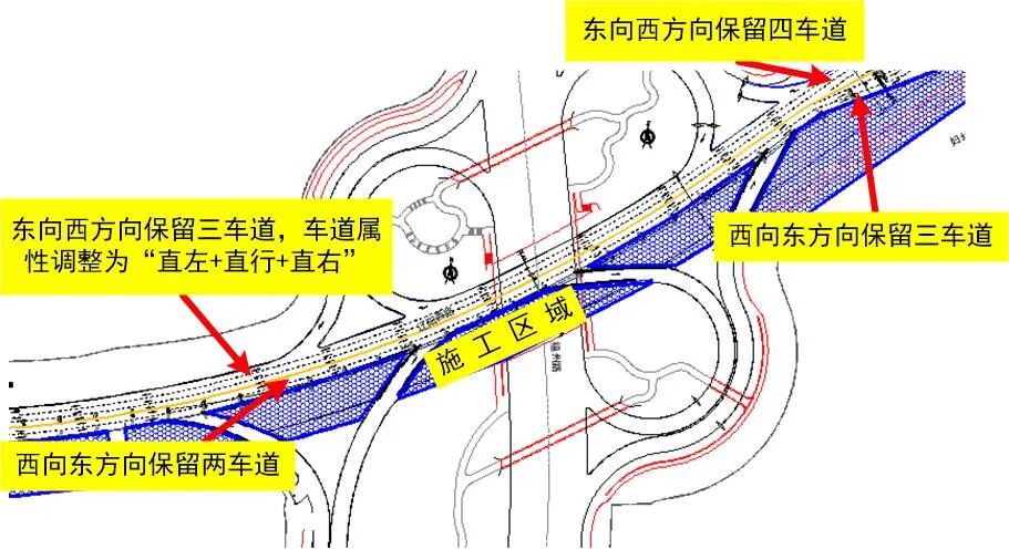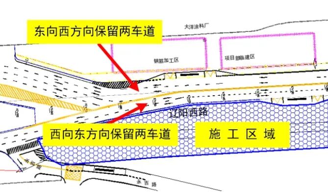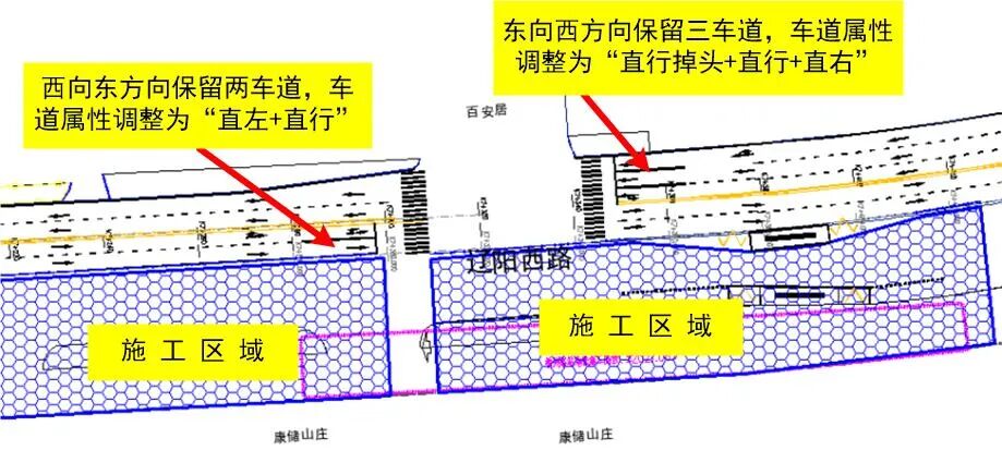 (2)百安居-同益路西100米路段:占用道路北側,西向東渠化為2車道,東向西渠化為3車道;福遼立交上下橋匝道橋道路暫時保留,施工過程中根據施工進度臨時調整。