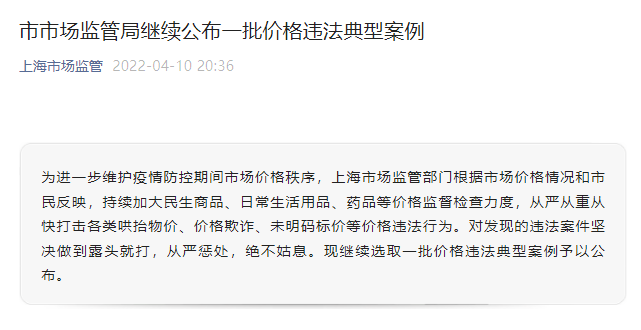 為進一步維護疫情防控期間市場價格秩序,上海市場監管部門根據市場價格情況和市民反映,持續加大民生商品、日常生活用品、藥品等價格監督檢查力度,從嚴從重從快打擊各類哄抬物價、價格欺詐、未明碼標價等價格違法行為。對發現的違法案件堅決做到露頭就打,從嚴懲處,絕不姑息。現繼續選取一批價格違法典型案例予以公布。