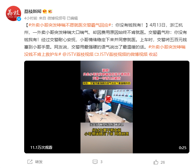 4月13日,浙江杭州,一外賣小哥突發哮喘大口喘氣,卻因費用原因始終不肯就醫。交警霸氣稱:你沒有錢我有!經過交警耐心安撫,小哥情緒穩定下來并同意就醫。上車時,交警將五百元錢塞到小哥手里。網友說,交警用最強硬的語氣說出了最溫暖的話。