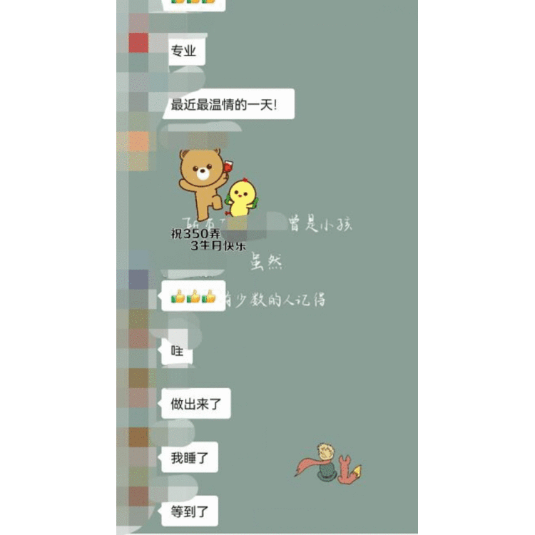 越來越多的人被這場特別的生日會(huì)感動(dòng),越來越多的潛水黨冒泡送生日祝福。有人特制了“祝350弄××號(hào)×××室(張瑋)生日快樂”“感謝350弄××號(hào)×××室(楊楊)和志愿者”表情包;有人送上詩作“從今把定春風(fēng)笑,且作人間長壽仙”,群里的氛圍達(dá)到了頂點(diǎn)。