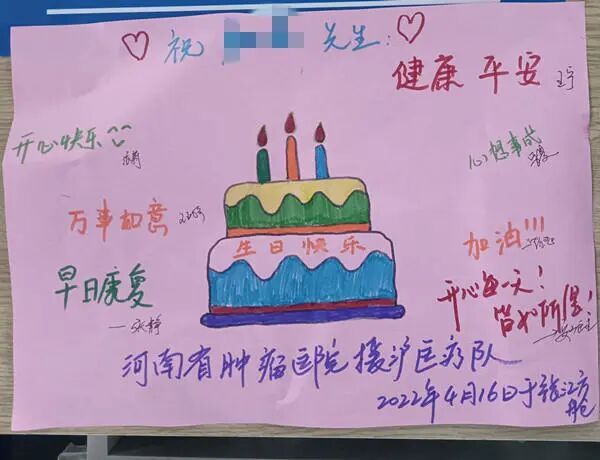 4月16日14:20,在去往張江方艙的班車上,負(fù)責(zé)8號(hào)樓2病區(qū)的河南省腫瘤醫(yī)院援滬醫(yī)療隊(duì)隊(duì)員王寧護(hù)士和安山醫(yī)生正在用手機(jī)查閱艙內(nèi)患者的信息,這樣可以提前熟悉患者的基本狀況,從而更好更快地投入艙內(nèi)工作。巧合極了,兩人不約而同地發(fā)現(xiàn)有位患者在當(dāng)天過生日。他們想為患者慶祝,可在疫情防控的特殊時(shí)期,物資相對(duì)匱乏,生日蛋糕恐怕無法買到,怎樣才能為患者度過一個(gè)有意義的生日呢?安山醫(yī)生提議:“咱們畫生日蛋糕,畫好以后讓同事每人寫上一句祝福語。”