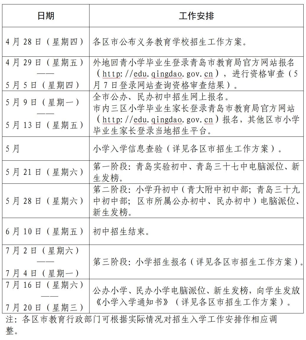 (1)在市內三區以外小學就讀,需回市內三區初中就讀的學生,于4月29日(星期五)至5月5日(星期四)登錄青島市教育局官方網站報名,進行資格審查。