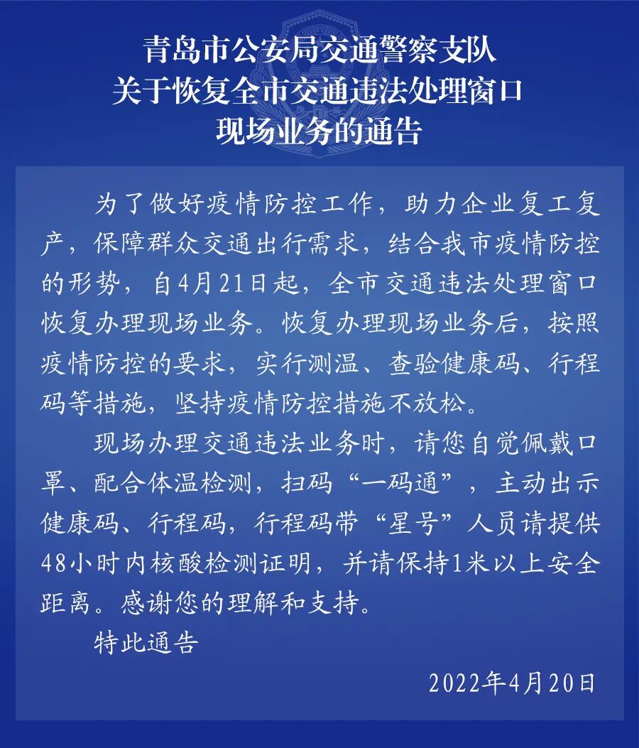 4月21日起,青島全市交通違法處理窗口恢復辦理現場業務