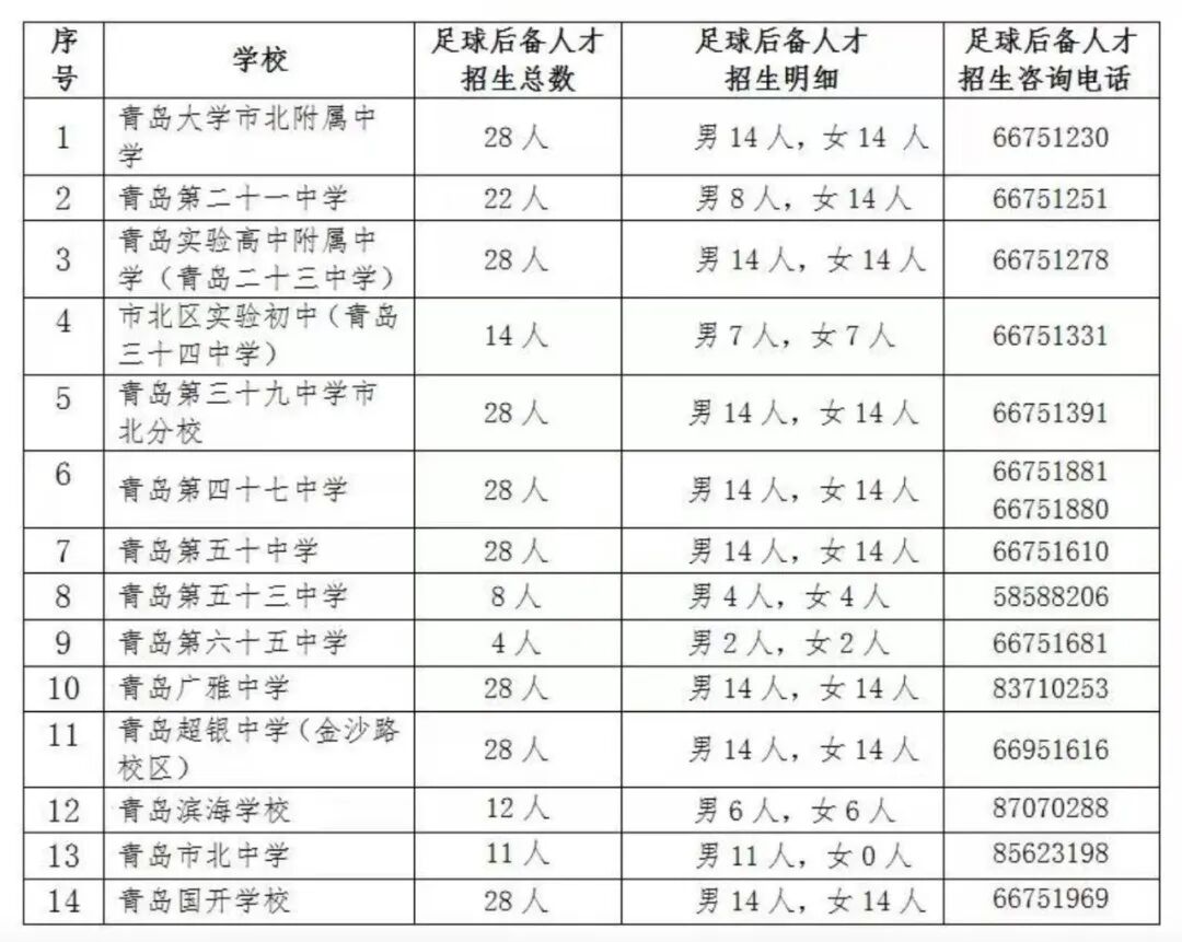 市北區(qū)14所初中計(jì)劃招收足球后備人才295人,其中青大市北附中、青島實(shí)驗(yàn)高中附中、青島三十九中市北分校、青島四十七中、青島五十中、青島廣雅中學(xué)、青島超銀中學(xué)(金沙路校區(qū))、青島國開學(xué)校均為28人,青島二十一中22人,市北區(qū)實(shí)驗(yàn)初中14人,青島五十三中8人,青島六十五中4人,青島濱海學(xué)校12人,青島市北中學(xué)11人。