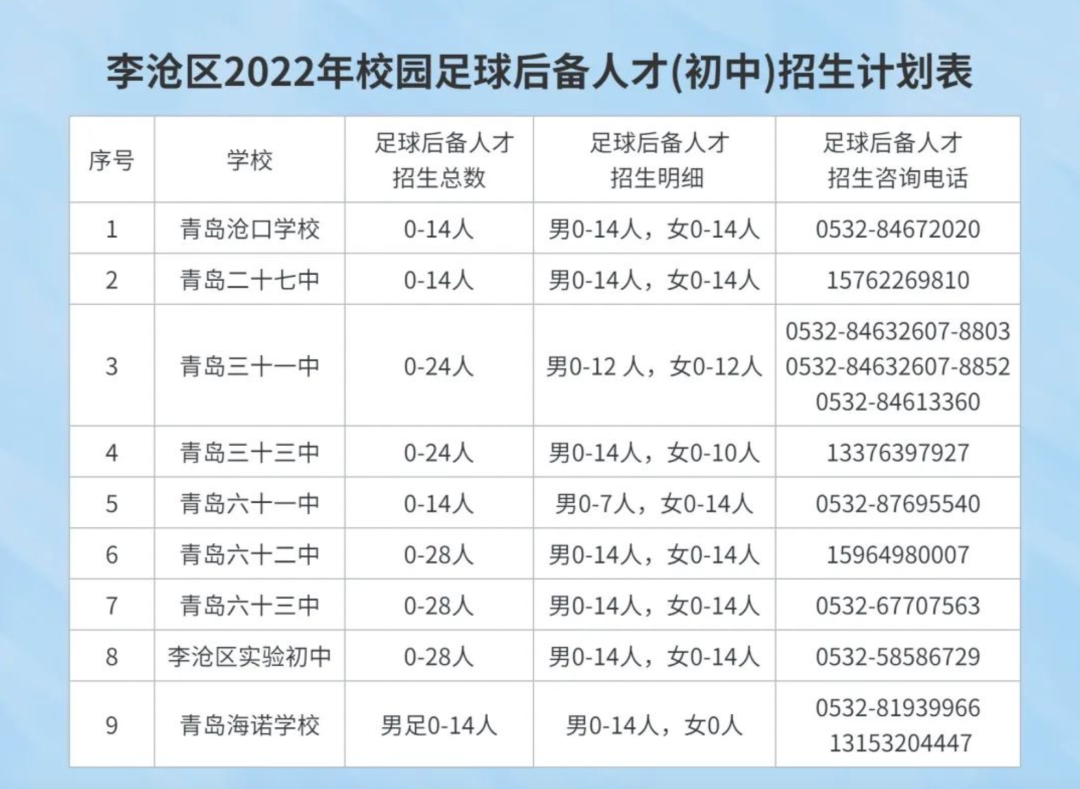 李滄區(qū)9所初中計(jì)劃招收足球后備人才188人,其中青島滄口學(xué)校、青島二十七中、青島六十一中、青島海諾學(xué)校均為14人,青島三十一中、青島三十三中均為24人,青島六十二中、青島六十三中、李滄區(qū)實(shí)驗(yàn)初中均為28人。
