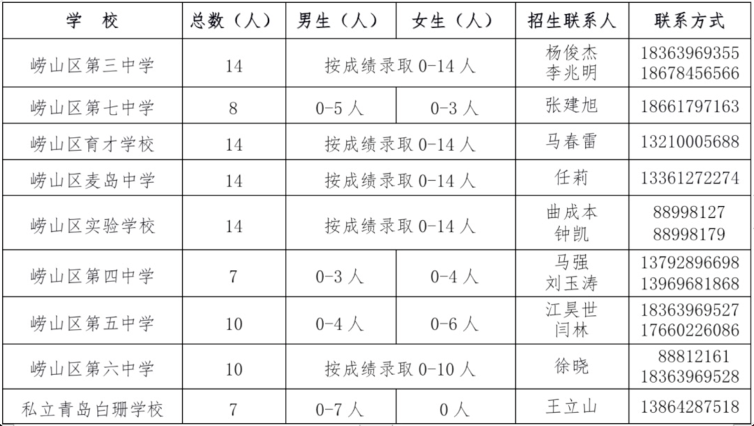 嶗山區(qū)9所初中計(jì)劃招收足球后備人才98人,其中嶗山三中、嶗山區(qū)育才學(xué)校、嶗山區(qū)麥島中學(xué)、嶗山區(qū)實(shí)驗(yàn)學(xué)校均為14人,嶗山七中8人,嶗山四中、私立青島白珊學(xué)校均為7人,嶗山五中、嶗山六中均為10人。