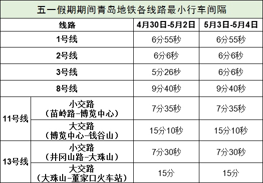 “五一”假期后,自5月5日起,青島地鐵各線路工作日、周末部分時段增加運力:8號線工作日早高峰時段行車間隔壓縮至9分40秒,線網各線路工作日平峰時段行車間隔壓縮1-3分鐘,線網各線路周末行車間隔壓縮1-4分鐘。