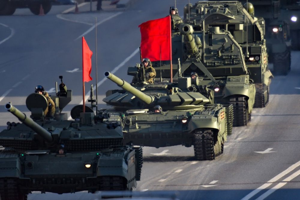 5月4日,在俄羅斯首都莫斯科,參加閱兵活動(dòng)彩排的軍用車輛從市區(qū)駛過。新華社發(fā)(亞歷山大攝)