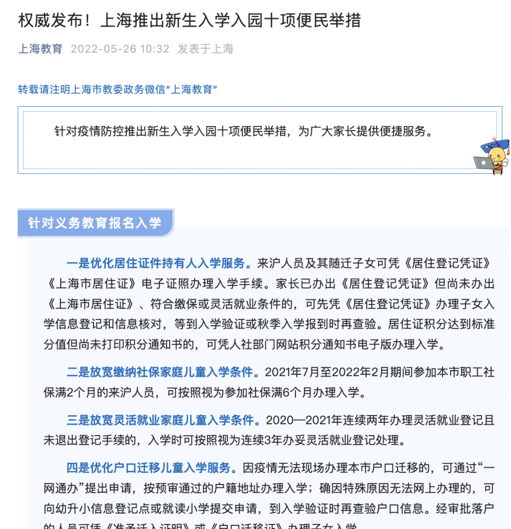 二是放寬繳納社保家庭兒童入學條件。2021年7月至2022年2月期間參加本市職工社保滿2個月的來滬人員,可按照視為參加社保滿6個月辦理入學。