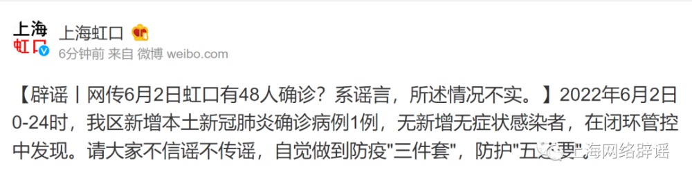 對此,虹口區通過官方微博發布辟謠信息,稱網傳6月2日虹口有48人確診系謠言,所述情況不實。2022年6月2日0-24時,虹口區新增本土新冠肺炎確診病例1例,無新增無癥狀感染者,在閉環管控中發現。根據虹口區衛健委的信息,該病例居住于:中山北一路131弄1支弄。已對相關居住地落實終末消毒措施。