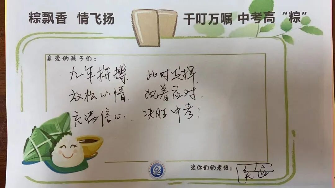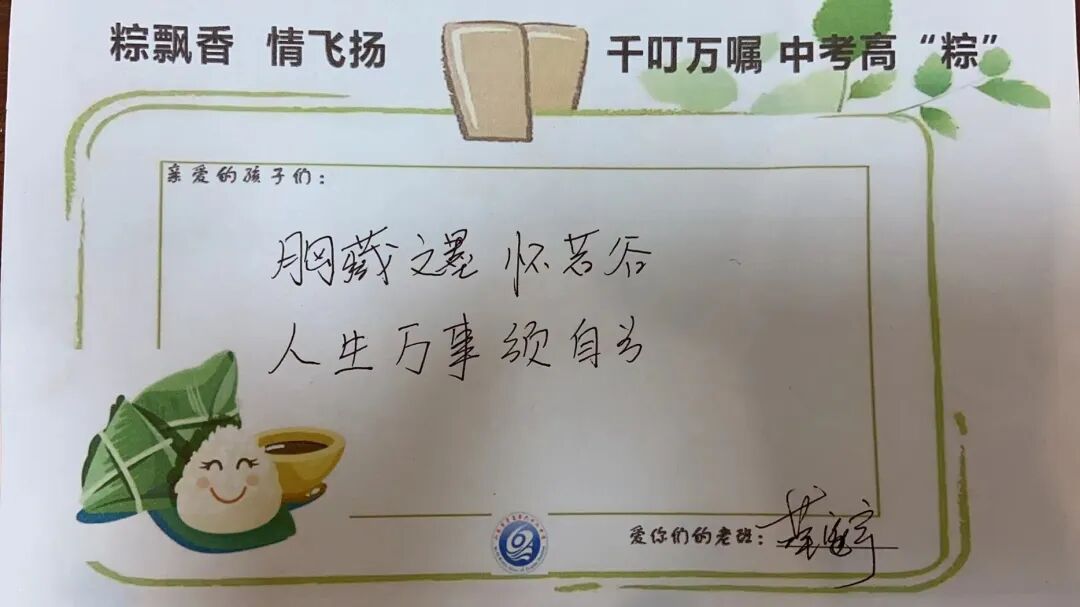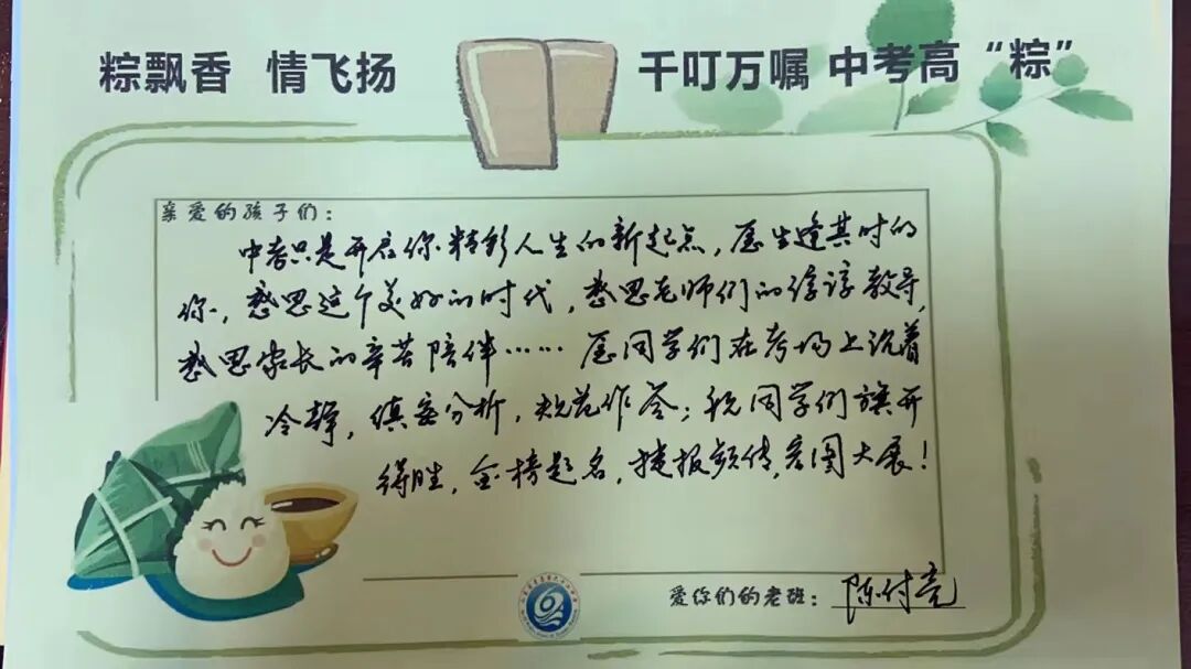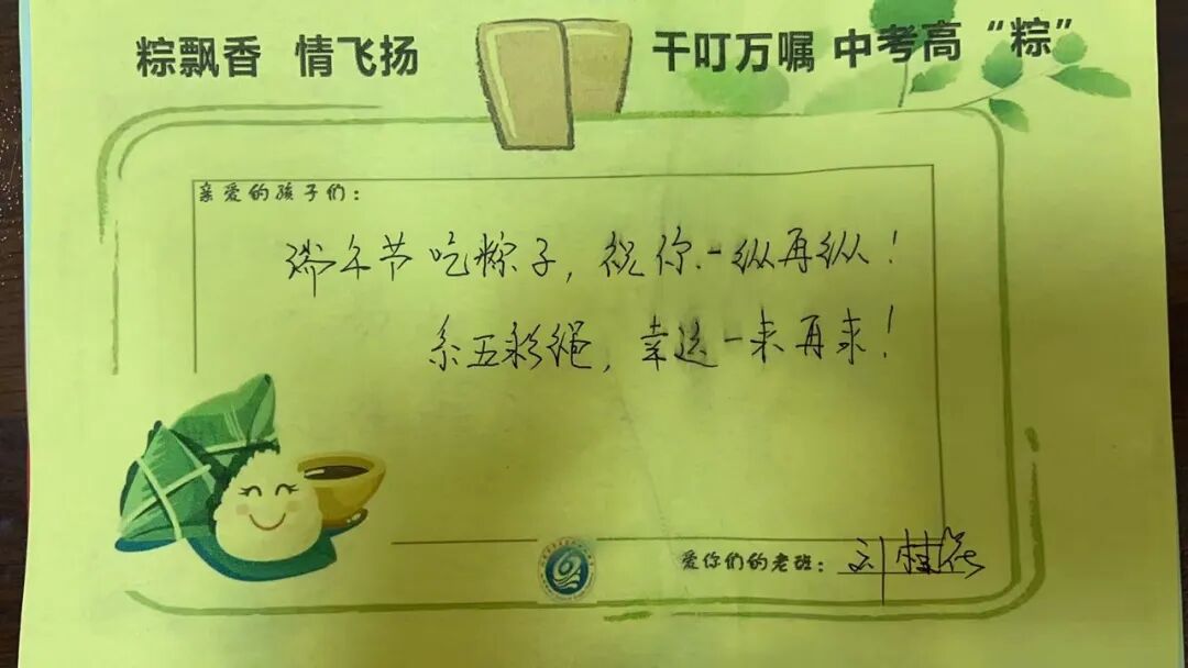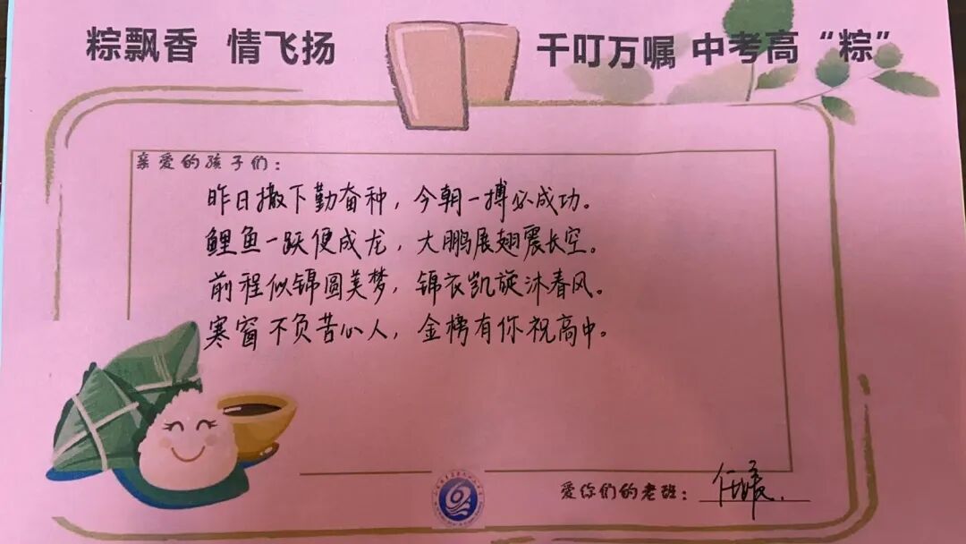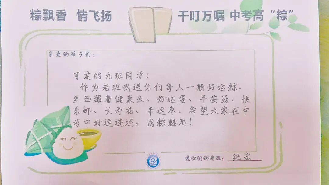 中考時節逢端午,還有不到十天,同學們即將啟程奔赴考場,迎接人生中一場重要的挑戰。如何讓同學們輕松迎戰,一舉高中,同時讓同學們知道,他們并不是一個人在戰斗,他們有學校和老師們給予的愛和關心作為強大的支撐,借此端午節契機,九年級班主任為同學們準備了一份充滿愛意的“高粽”——