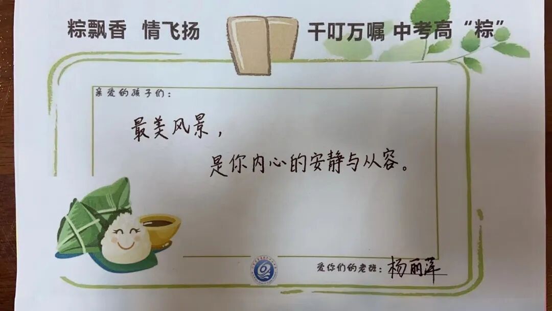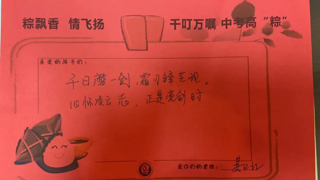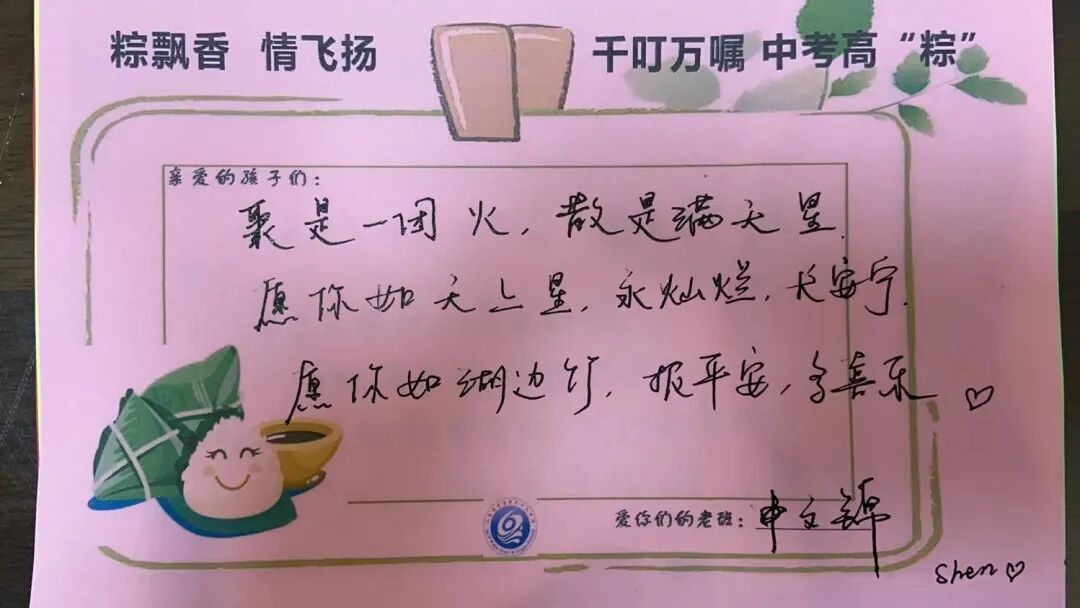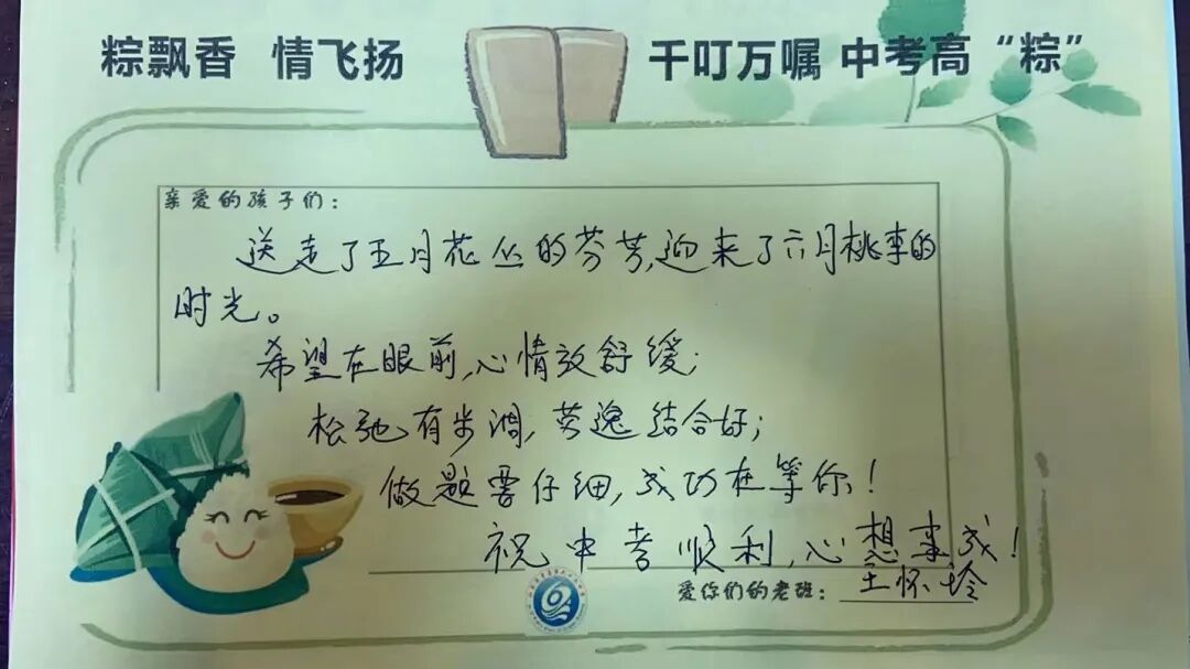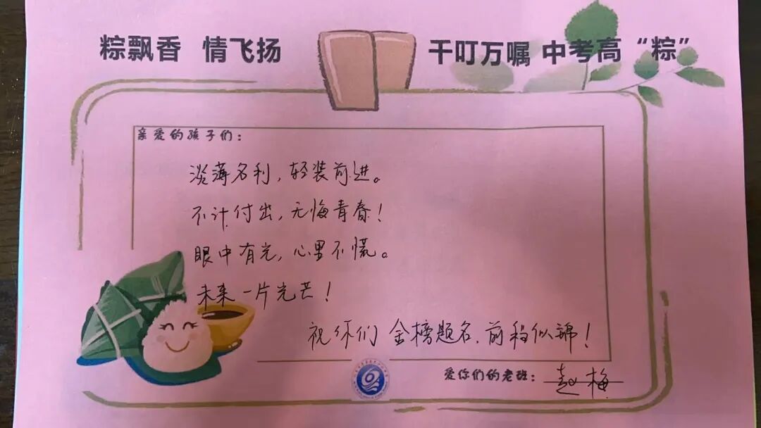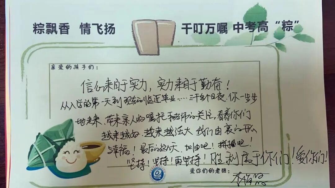 中考時節逢端午,還有不到十天,同學們即將啟程奔赴考場,迎接人生中一場重要的挑戰。如何讓同學們輕松迎戰,一舉高中,同時讓同學們知道,他們并不是一個人在戰斗,他們有學校和老師們給予的愛和關心作為強大的支撐,借此端午節契機,九年級班主任為同學們準備了一份充滿愛意的“高粽”——