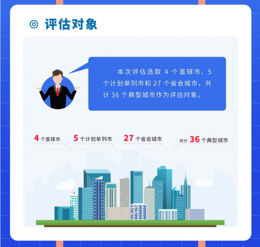報告選取4個直轄市、5個計劃單列市和27個省會城市,共計36個典型城市作為評估對象,以上一年度統計數據為基礎,由第三方機構獨立開展評估。